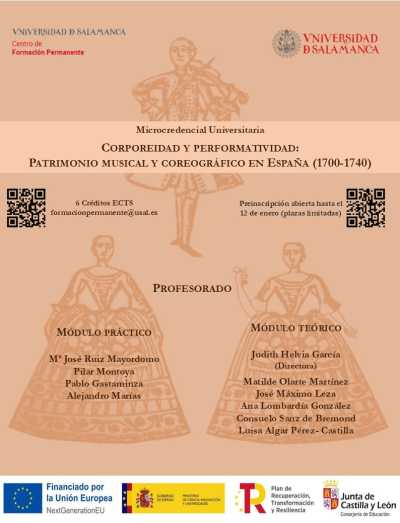 A pioneering training experience, with 6 ECTS credits and 60 hours of instruction. Entitled "Corporeality and Performativity: Musical and Choreographic Heritage in Spain (1700-1740)," it offers training, both practical (in-person) and theoretical (online), that addresses Spanish choreographic and musical heritage in a holistic and transdisciplinary manner. An exceptional faculty has been assembled to offer this elite, transdisciplinary, and affordable training. This micro-credential will cover the musical, choreographic, and iconographic sources of Spanish Dance and Baroque Academic Dance from the mid-18th century. Above all, it will be delivered through in-person practical instruction from renowned music and dance professionals with extensive experience. Registration closes: January 12, 2026.| Attachment | Size |